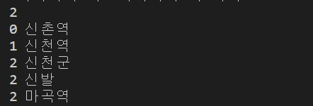 samples=["신촌역", "신천군", "신천역", "신발", "마곡역"]